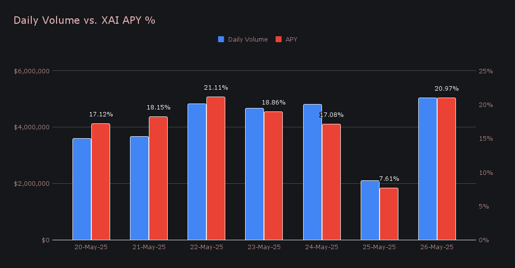 This stretch also delivered some of the strongest staking yields in recent weeks, as the average APY climbed to 17.27%, driven by consistently solid daily volumes. The standout came on May 22nd, when 70,267.86 XAI was deposited directly to our staking vault at a 21.11% APY, alongside a noteworthy $4.82m in volume. In total, stakers earned 407,424.16 XAI, or $56,295.42 USD across the week.
