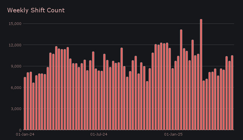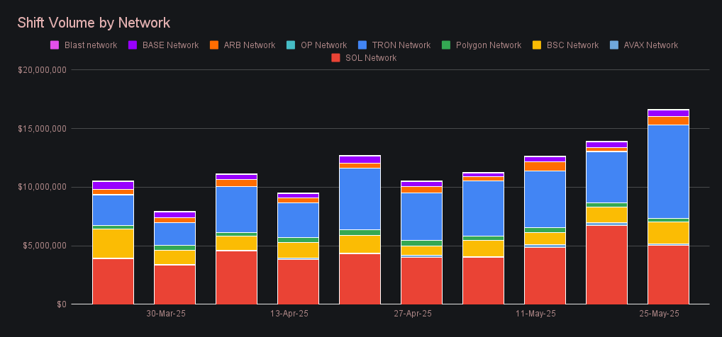 SideShift saw a convincing uptick across the board, with total volume climbing +26% to $28.6m, a figure now sitting nearly +40% above our running YTD average. User shift volume rose +20.3% to $20.5m, particularly fueled by a rise in activity directly on site. Liquidity shifting also jumped +43% to $8.1m, mostly driven by uneven stablecoin flows and elevated BTC demand, which together required increased internal rebalancing.