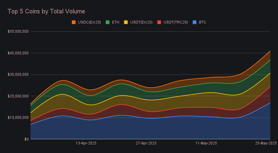 Stablecoins followed with contrasting momentum. USDT (TRC-20) ranked second, with $7.6m (+94.2%), buoyed by a +199.5% surge in deposits to $3.3m, one of its strongest user inflows in recent memory. Settlements, however, dipped to $1.4m (-6.8%), outlining the stark imbalance of the two sides, something further highlighted by the asymmetry of the week’s top user shift pair. USDT (ERC-20) followed in third with $6.2m (-9.4%), a still-solid figure, but one that stood out less amid the broader jump in coin activity, as both deposits (-6.1%) and settlements (-15.7%) slid slightly.