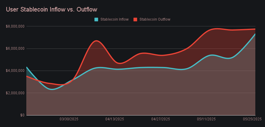 A related shift in stablecoin dynamics came via user flows, which swung upward this week by +$2.04m to produce a net outflow of -$422,010, a significant reversal from last week’s -$2.47m total. This was largely influenced by a series of whale-size USDT (TRC-20) to BTC shifts, and reflects a narrowing spread between inflow and outflow, as shown in the chart below.
