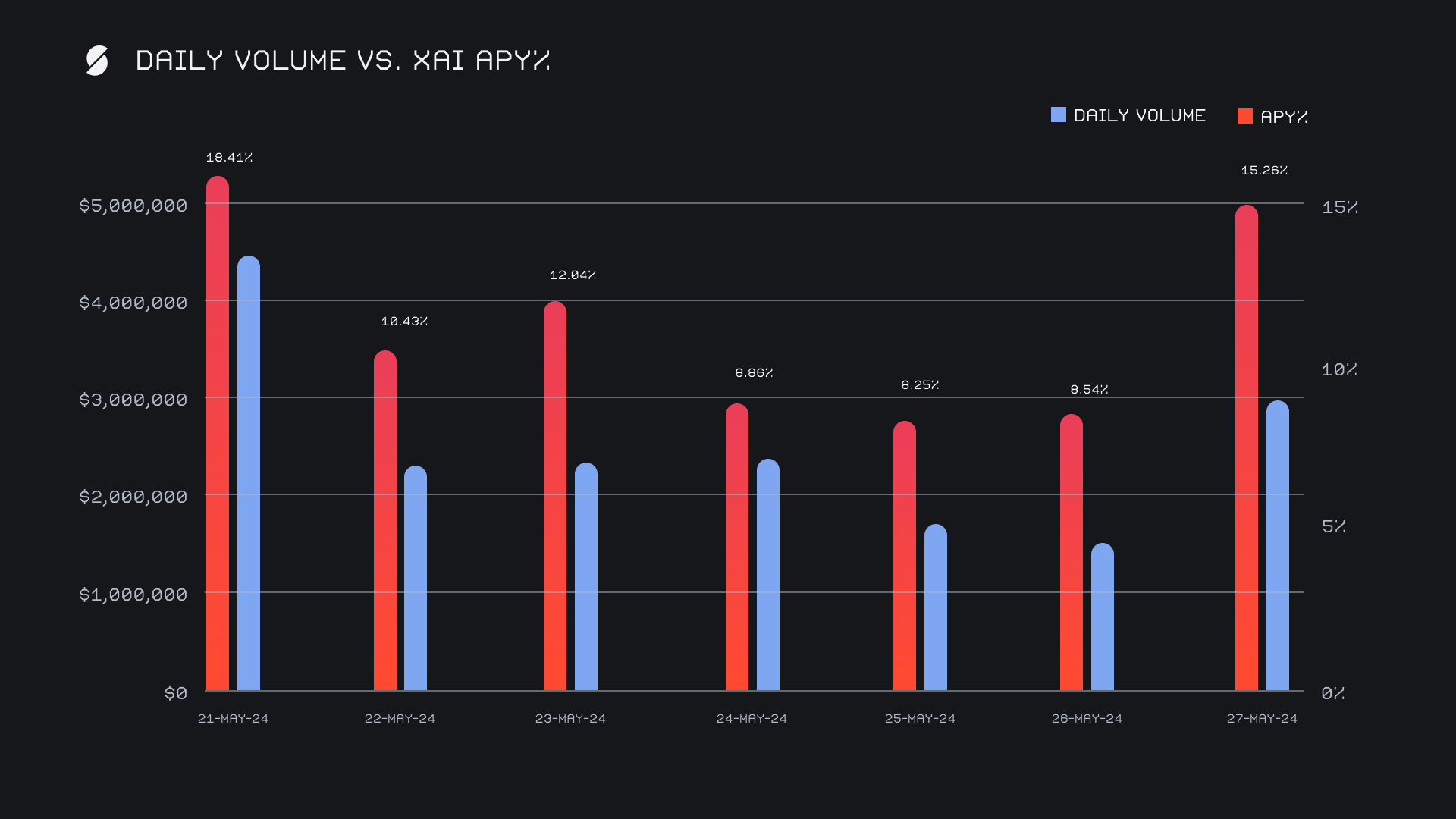 XAI stakers enjoyed an average APY of 11.68% this week, with a daily rewards high of 55,585.53 XAI (an APY of 18.41%) being distributed to our staking vault on May 22nd, 2024. This was following a sizable daily volume of $4.5m. This week XAI stakers received a total of 253,579.31 XAI or $50,589.07 USD in staking rewards.
