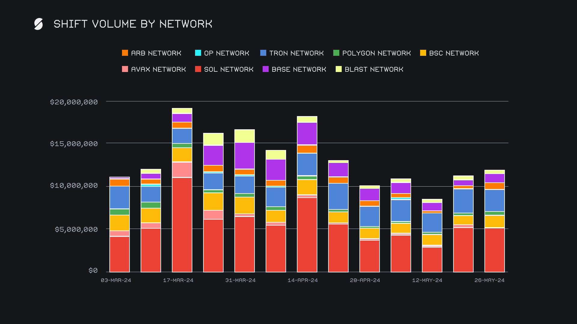 Although mainnet ETH captured the majority of users attention, it should be mentioned that ETH on alternate chains also saw a jump in user activity on SideShift. ETH on Base sat right outside of our top 5 this week, as its total volume increased +30.5% for $925k. ETH on Arbitrum spiked a more impressive +110% after a couple of weeks of fairly low action, ending with $515k. Finally, ETH on Blast continued the pattern and rose +19.7% for a total of $457k.