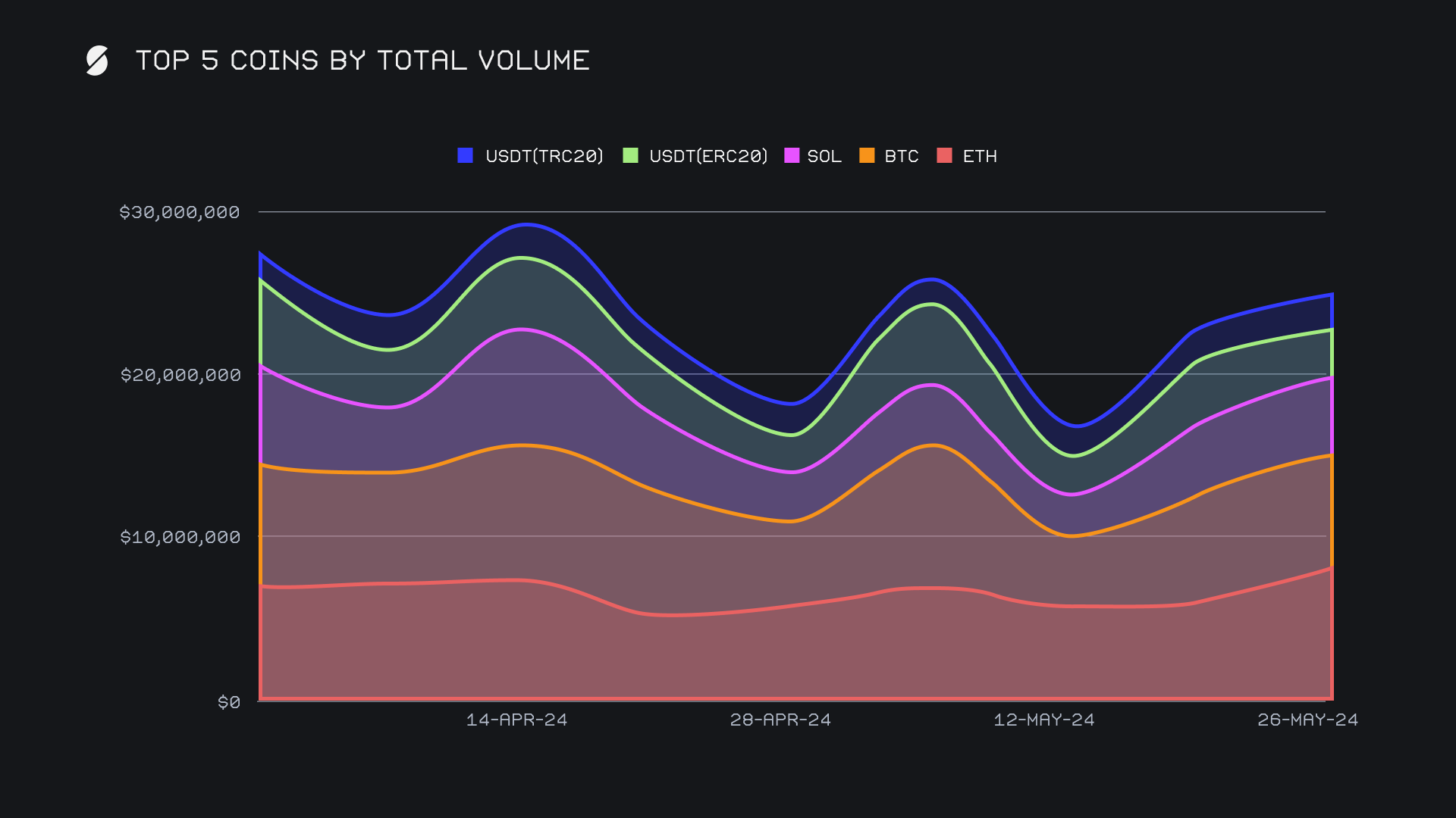 ETH asserted its dominance with a remarkable rise in total volume, surging by +39% to reach $8.2m overall. It ended up towering more than $1m higher than second placed BTC. This came from a breakdown of $2.7m to $4.0m in user deposits vs. settlements, a variance which provides a clear indication of the current demand for ETH with user settlements skyrocketing +84.4%. A bulk of this settlement volume stemmed from both the SOL/ETH and BTC/ETH pairs, which finished with respective weekly sums of $1.3m and $1.2m. This week’s ETH volume represented a 2 month high on SideShift, not seen higher since March 2024, when ETH briefly breached the $4k mark.