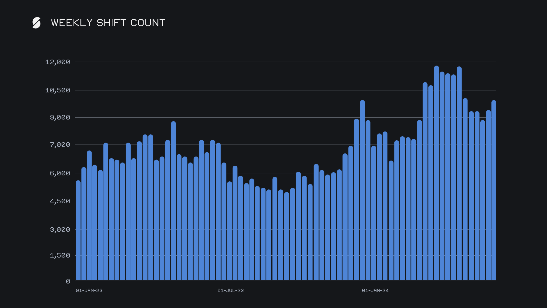 Similarly, our gross shift count saw a +5.4% uptick, moving from 9,392 shifts last week to 9,899 shifts this week. As seen in the chart below, the upwards trend for weekly shift count began in mid 2023 and looks to be continuing on, as we now are once again sitting just shy of the 10,000 shifts per week benchmark. This week, our weekly volume and count combined to produce daily averages of $2.5m on 1,414 shifts.