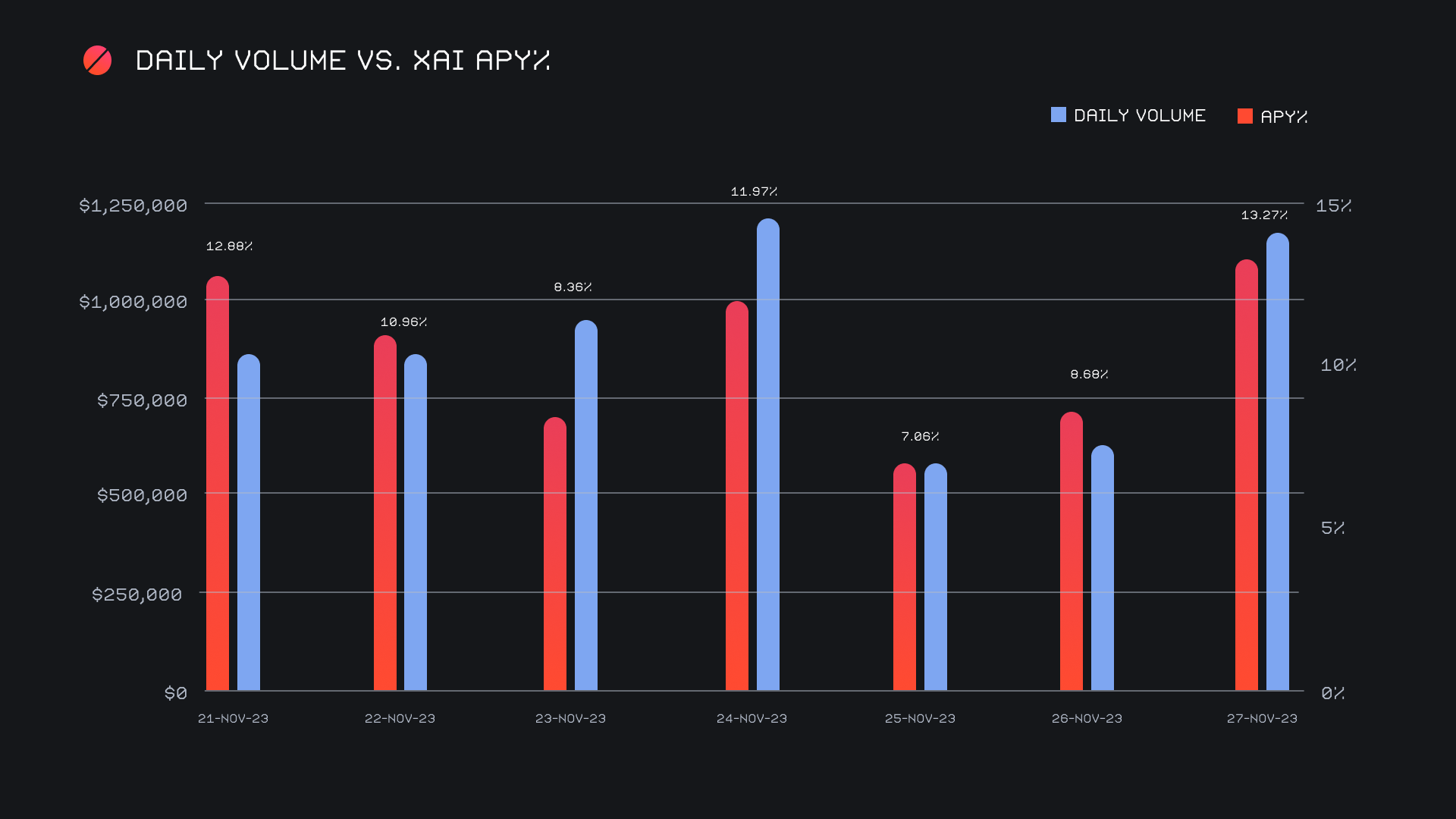 XAI stakers were rewarded with an average APY of 9.99% this week, with a daily rewards high of 38,709.41 XAI being distributed to our staking vault on November 28th, 2023. This was following a daily volume of $1.2m. This week XAI stakers received a total of 215,620.18 XAI or $17,723.98 USD in staking rewards.