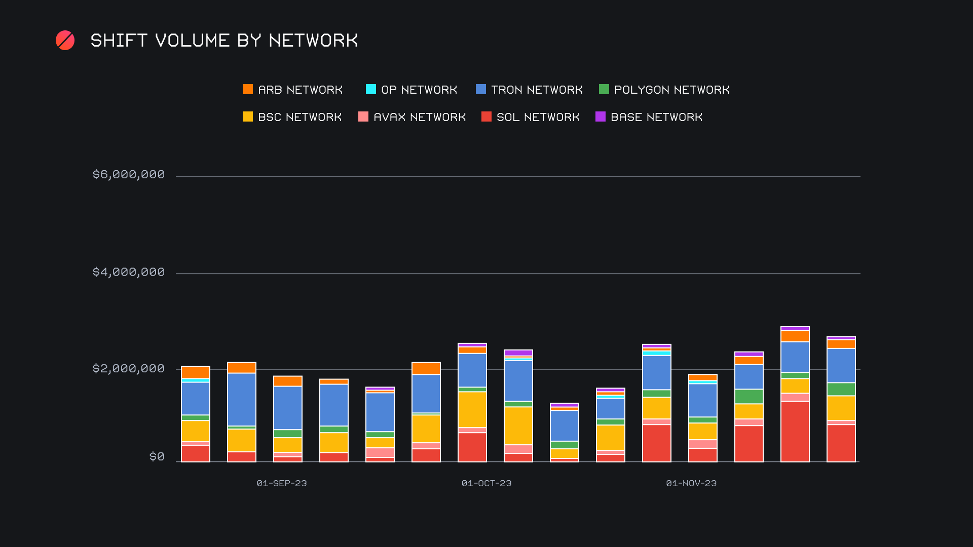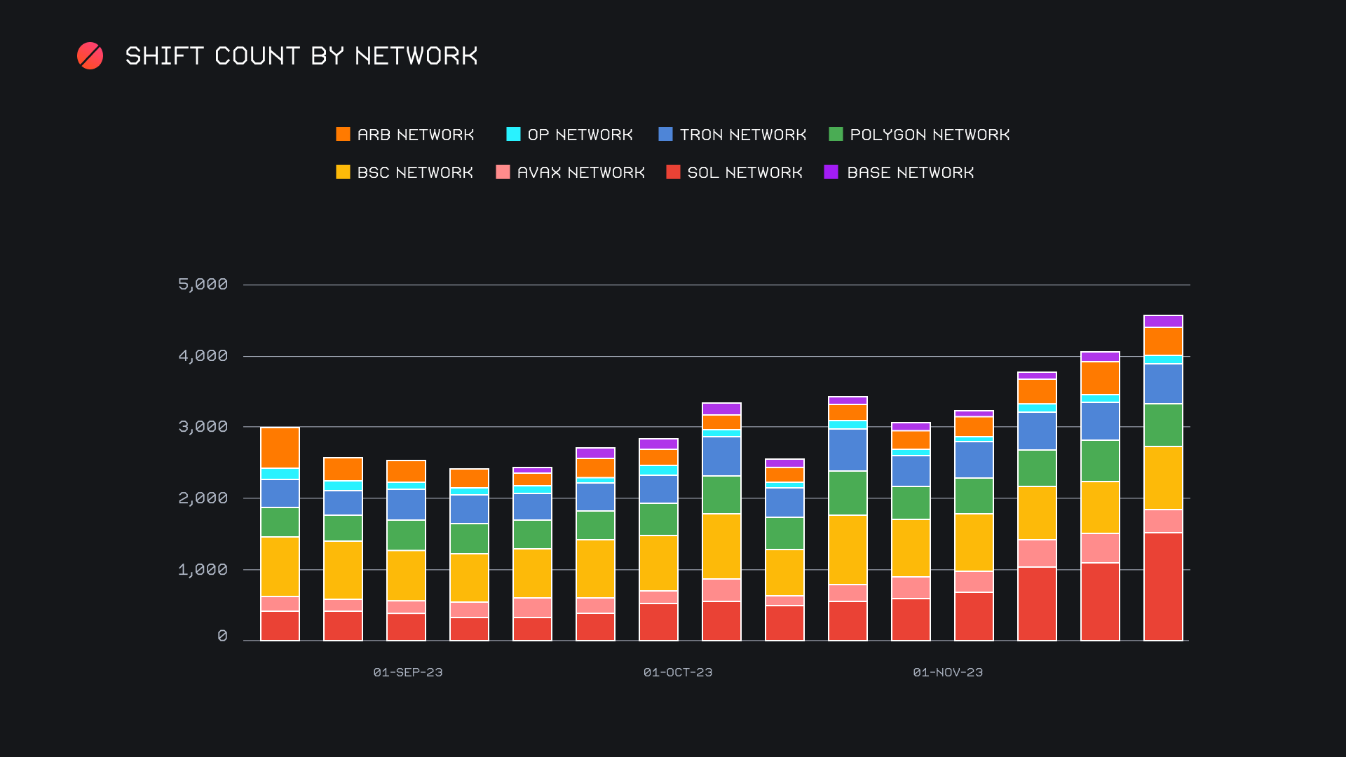 A final perspective on the positive behavior of alternate networks to ETH is evident when taking a look at shift count over the previous 4 months. Here we can note an extremely consistent uptick in gross shift count, a figure which has nearly doubled since the end of September, 2023. The momentum of the Solana network is easily visible within the chart, as this week it recorded a sizable total of 1,560 shifts. Not far behind sat the TRON network, finishing with a 4 month high shift count of 1,357. The BSC network performed well too, exceeding the upper boundary of its 4 month average, with 919 shifts. Even lower volume networks such as Polygon and Arbitrum still generated a respectable amount of shifting, with respective counts of 578 and 424. Ultimately, this growth showcases the use case and utility for SideShift, and it is a bullish sign to see users utilizing a variety of networks. With a combined count which is already nearly double that of the Ethereum network, it is possible that we continue to see the use of alternate networks trend upwards as network fee pressure on Ethereum becomes more burdensome.