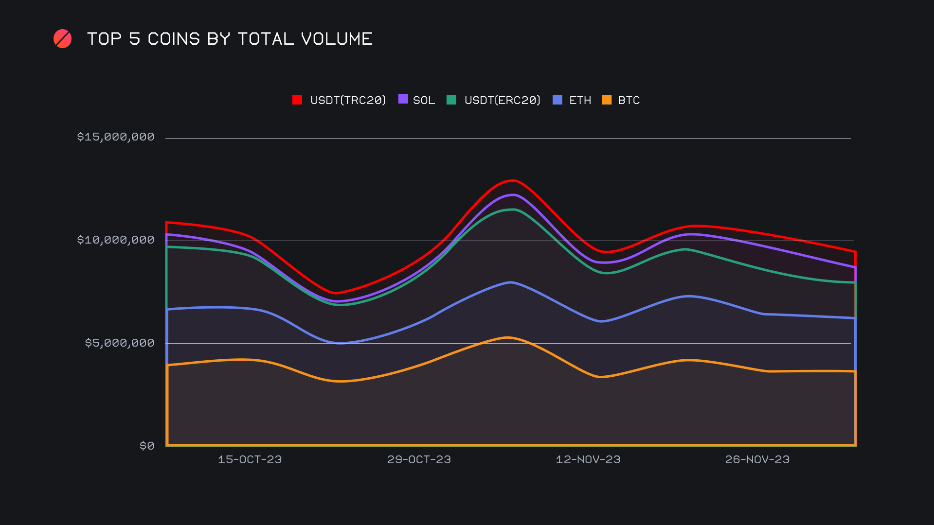 The coin that was hit the hardest was SOL, which saw its total volume decline -36.3% to end with a gross $753k in weekly shifts. This decline was to be expected and came after nearly a month of solid growth, which saw the total volume of SOL blossom from ~$200k to over $1m. Using SOL and ETH as examples, we can observe how the attention of users oscillates back and forth between BTC and other top coins between periods of momentum and stagnation. As a whole, our top 5 coins remained unchanged this week but slipped below the $10m mark, ending with a combined sum of $9.3m.