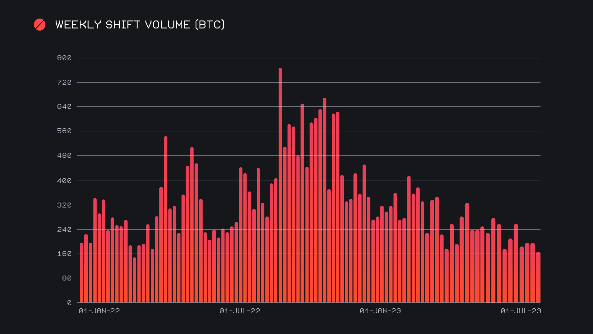 SideShift had a slower showing, noting a decline in shift volume due to the overarching sideways price action. We ended the period with a gross volume of $6.3m (-13.9%), due to less volume coming from both affiliate shifts and those carried out directly on the site. However, in spite of this decline, shift count performed stronger than ever, breaching the 7k mark and rounding off the week with a gross count of 7,031 (+14.5%). In this regard, the bulk of the increase in count can be attributed to shifts taking place directly on the site, that was shared across a breadth of networks. Together, these figures combined to produce daily averages of $899k on 1,004 shifts. When denoted in BTC, our weekly volume amounted to 168.97 BTC (-15%).