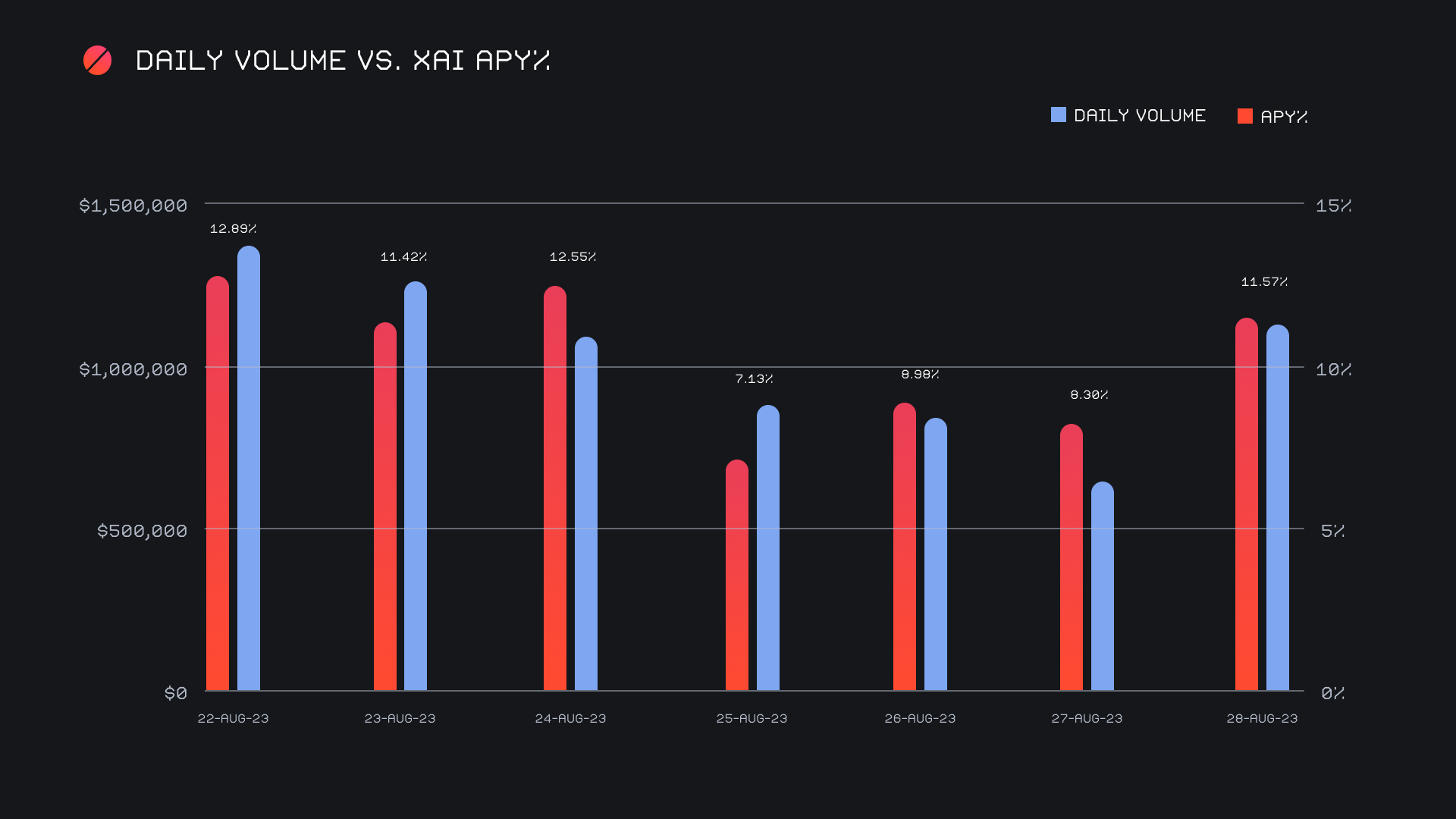 XAI stakers were rewarded with an average APY of 10.21% this week with a daily rewards high of 36,752.90 XAI or 3,423 with an APY of 12.89%. being distributed to our staking vault on August 23rd, 2023. This was following a daily volume of $1.4m. This week XAI stakers received a total of 209,893.97 XAI or $19,310.25 USD in staking rewards.