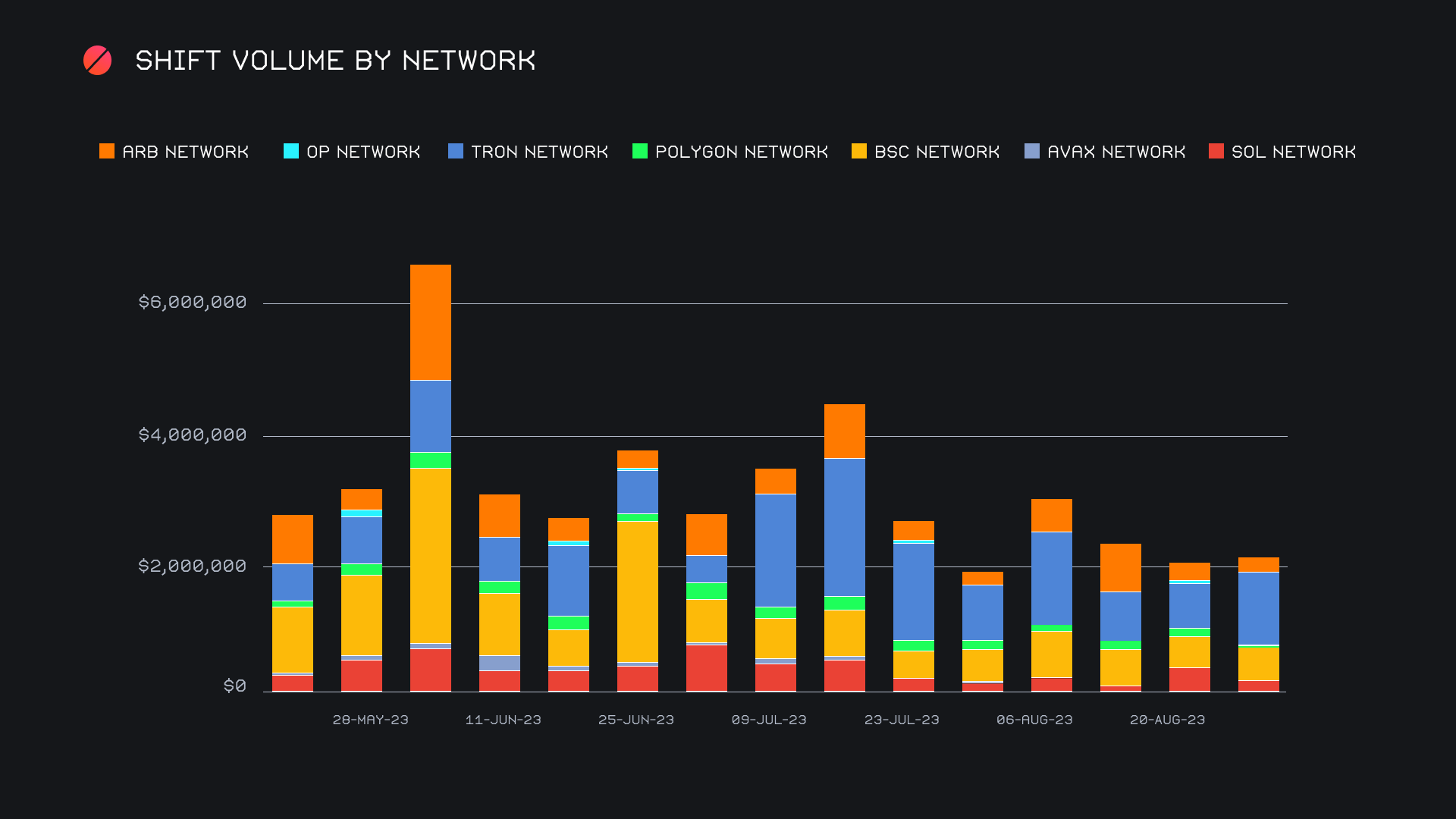 This uptick in USDT (TRC-20) shifts surely led the charge for the Tron network, as it came to account for a far larger proportion of shifting on alternate networks to ETH this week. While these alternate networks combined for a total $2.1m (+3.3%), the Tron network grew 56.6% to secure the top spot with $1.1m. You can visualize its growth in the below chart. Interestingly, this coincided with a decrease in nearly every other network. With $489k (+7.7%), the second placed Binance Smart Chain (BSC) network was the only other to see a rise. All others saw a decline at or exceeding 30%, including the third placed SOL network, with $266k (-40.9%).