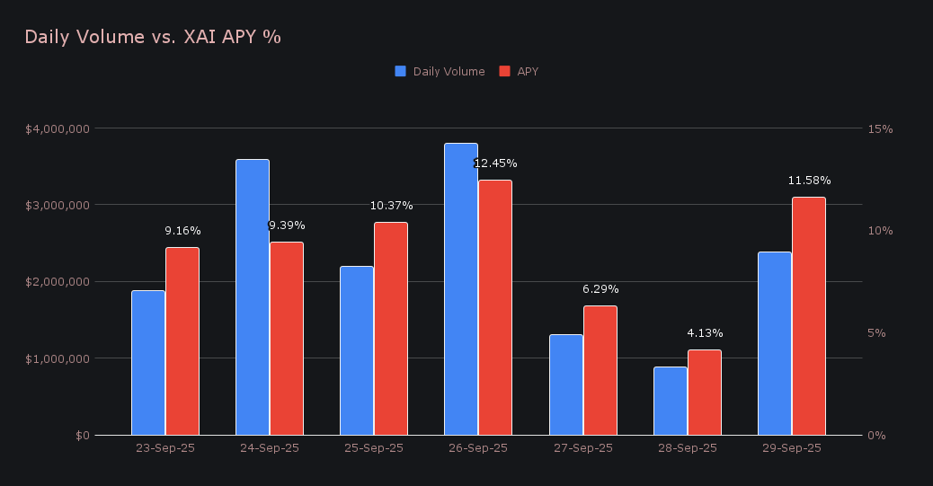 Staking totals told a similar story and closed lower, with 229,931.48 XAI ($35,774.04) distributed to the staking vault at an average yield of 9.05% APY. September 26th marked the peak day, with 44,637.69 XAI rewarded at 12.45% APY alongside $3.79m in daily volume. Both rewards and yields finished the week below the prior period, rounding out an overall quieter stretch for staking activity.