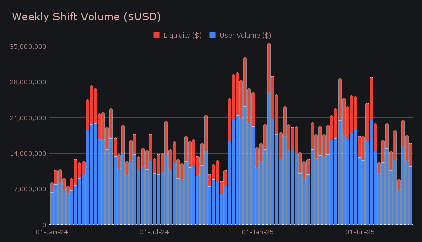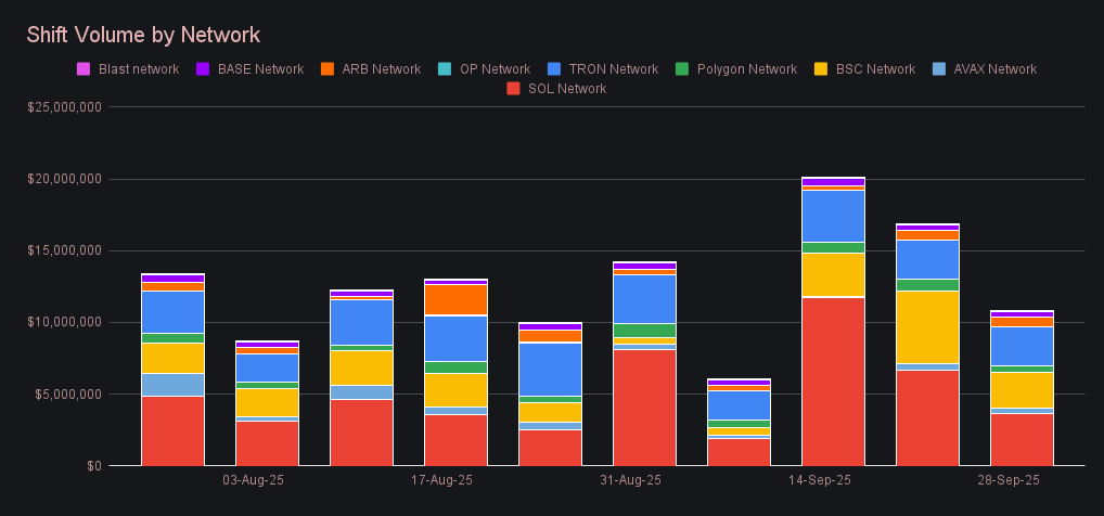 - SideShift volume totaled $16.01m with 8,734 shifts, keeping activity broadly in line with recent weeks.