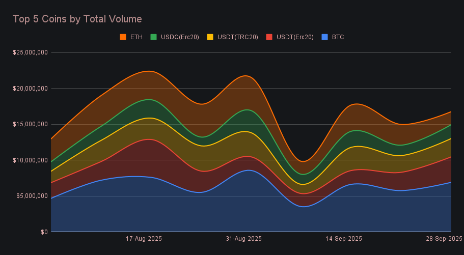 Stablecoins reestablished their presence on the leaderboard, led by USDT (ERC-20) which jumped back to second place with $3.55m (+39.1%) in total volume. After only just rejoining the top 5 last week following a prolonged lull, it pushed higher again as user deposits more than doubled to $1.76m (+143.6%), highlighting its role as the main inflow coin for BTC. USDT (TRC-20) followed at $2.55m (+9.7%), with a steadier balance of $514k in deposits (−6.1%) and $1.11m in user settlements (+8.3%). USDC (ERC-20) also advanced to $1.93m (+33.2%), supported by user settlements nearly doubling to $937k (+95.8%) — the highest settlement total among stablecoins this week. Collectively, the reappearance of these three core stables marked a return to the familiar form that has dominated for much of the year, replacing newer variants like USDT (BSC) and USDC (SOL) which slipped off the board.
