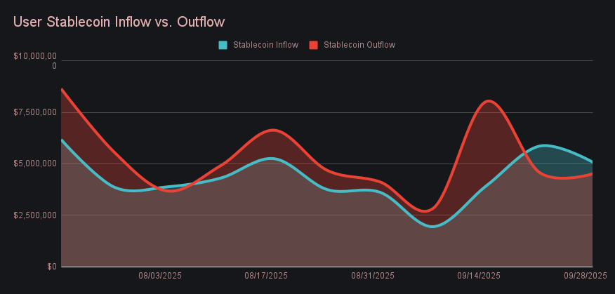 ETH slipped to the bottom of the leaderboard with $1.81m (−37.2%), weakening further after already falling last week. User deposits landed at $876k (−33.2%), while settlements eased to $697k (−10.5%). It was among the sharpest drops in the top group, second only to SOL, which slid to seventh after a swift tumble of −59% in total volume to $1.68m. Together, the declines left both ETH and SOL lagging notably, marking a clear departure from weeks when they had taken turns anchoring the top group. With their pullbacks, the spotlight shifted decisively back to BTC and the core stablecoins, which absorbed the bulk of weekly volume.