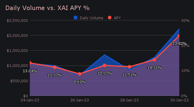 XAI stakers were rewarded with an APY averaging 13.54% throughout the period, with a daily rewards high of 47,374.97 XAI (a 23.82% APY) being deposited to our staking vault on January 31st, 2023. This was following a daily volume of $2.21m.