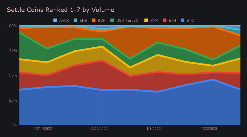 The volatility of coins outside the top 3 tends to be quite sporadic on both the deposit and settle sides, but what is evident is the relative stability of our top coin, BTC. You can see in the chart below how it constantly has remained near ~30% of settle volume, with BCH in particular oscillating wildly back and forth. The volume swings become even more pronounced the further you move down the ranks. This week saw BTC make up 22% ($1.3m) of settlements from SideShift, with XMR being the most popular deposit coin as its pairing.