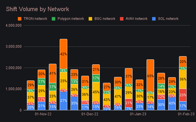 Interestingly, a majority 73% of this deposited BNB volume was shifted to AVAX, which mainly contributed to the more than 20x increase recorded in AVAX settlements ($296k). It’s great to see less common shifts emerge among the top pairs, and observe how users are utilizing SideShift. You can note the effect this pair had on proportionate network shifting in the bar chart below, and in particular how abnormal the spike in AVAX volume was.