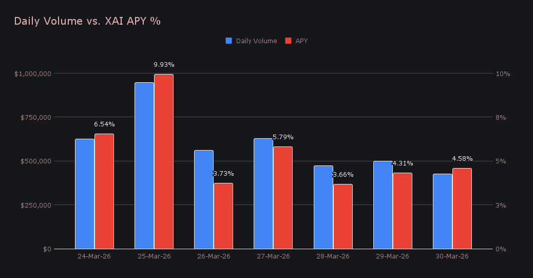 Despite a tough week for gross volume, XAI staking held its ground with 145,465.29 XAI ($12,406.68) distributed at a 5.51% average APY, finishing just below last week's snapshot of 5.53%. March 25th was the standout day, when 36,810.37 XAI was sent directly to the staking vault at a 9.93% APY on the back of $945k in daily volume. XAI itself remained flat, and is currently trading at $0.0850, with its market cap settling at $13.28m (-0.59%).