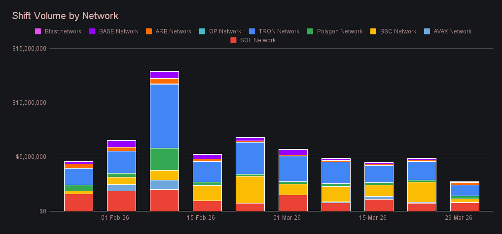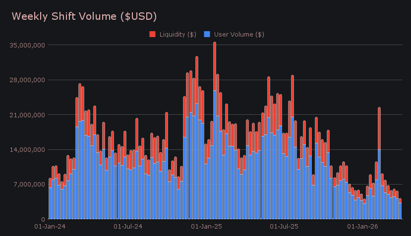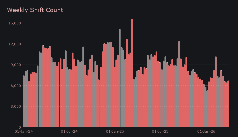 Shift count came in at 6,700 (+4.2%) for a daily average of 957, the only metric to finish the week in positive territory. Looking closer at the breakdown though, the growth was driven entirely from the bottom of the size spectrum. Sub-$100 shifts grew to 4,343 from 3,922, while shifts above $10k fell to just 85, their lowest point in months, a band that had already been trending down since the 610 recorded in early February. That group produced just $2.04m in volume compared to $2.93m last week, and the average shift size falling to $619 from $880 captures the same story from a different angle. Activity was there, but the participants moving meaningful volume largely weren't.