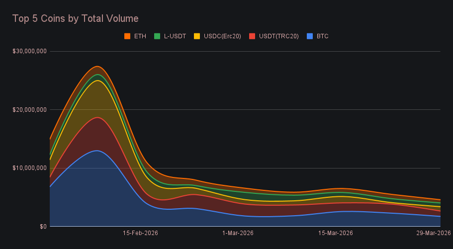 BTC held onto first place at $1.75m (-24.3%), though with a composition that stood in stark contrast to last week's. User deposits came in at $993k (+105.5%) while settlements collapsed to $291k (-74%), a clean reversal from last week where settlements were more than double deposits as users bought into BTC's relative strength. With price sliding through the week, users moved decisively out of BTC positions. USDT (TRC-20) followed in second at $921k (-40.7%), marking its first finish below $1m this year, with deposits and settlements landing within 5% of each other at $395k and $380k — a surprisingly balanced result for a coin that has spent most of 2026 as the platform's heaviest settlement preference. USDT (BSC) was the notable absence after last week's $1.49m, plummeting to just $169k, a coin that has shown it can violently swing in either direction from one week to the next.