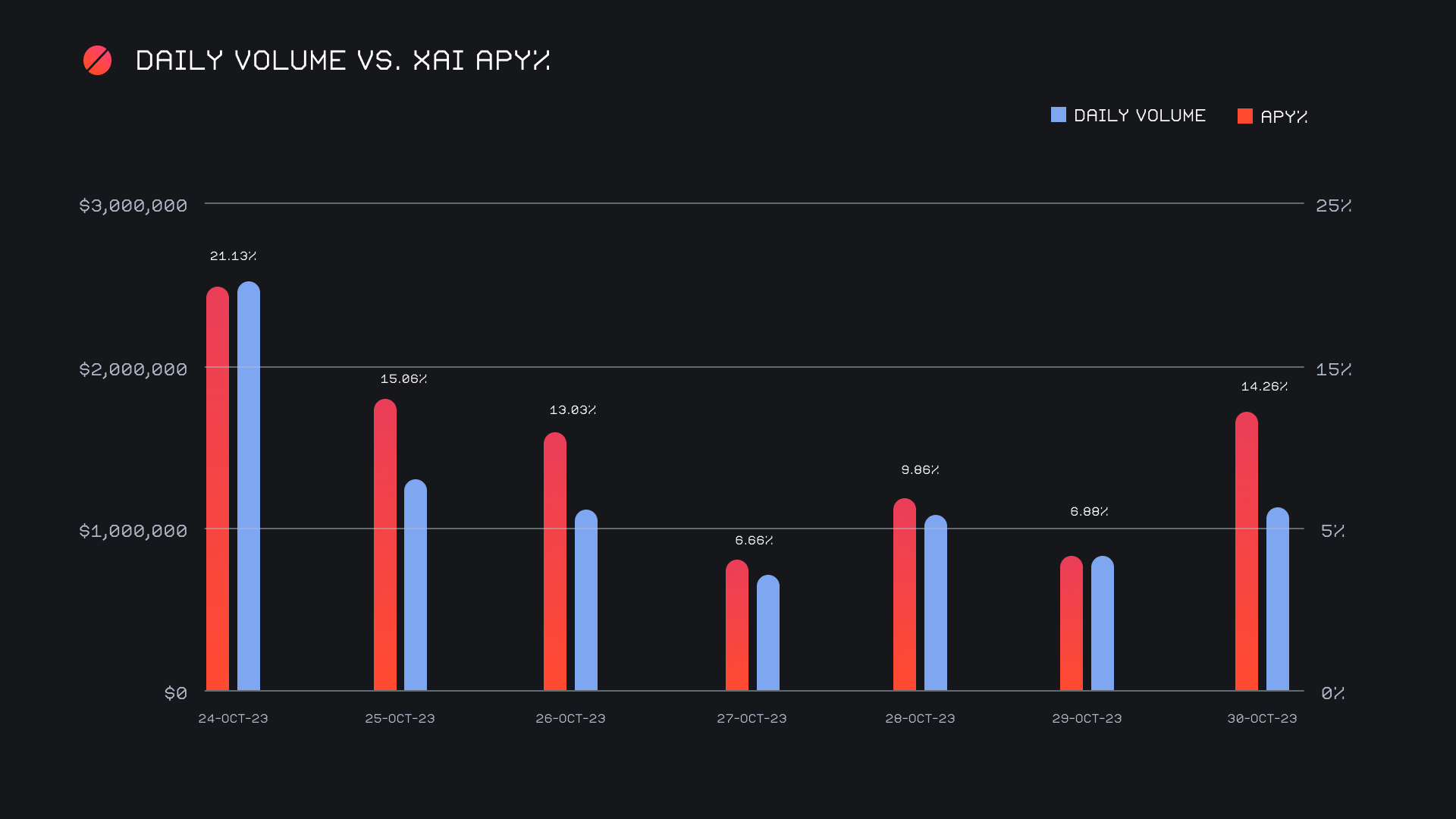 XAI stakers were rewarded with an average APY of 12.1% this week, with a daily rewards high of 58,986.06 XAI being distributed to our staking vault on October 25th, 2023. This was following a daily volume high of $2.5m. This week XAI stakers received a total of 250,336.32 XAI or 20,352.34 USD in staking rewards.