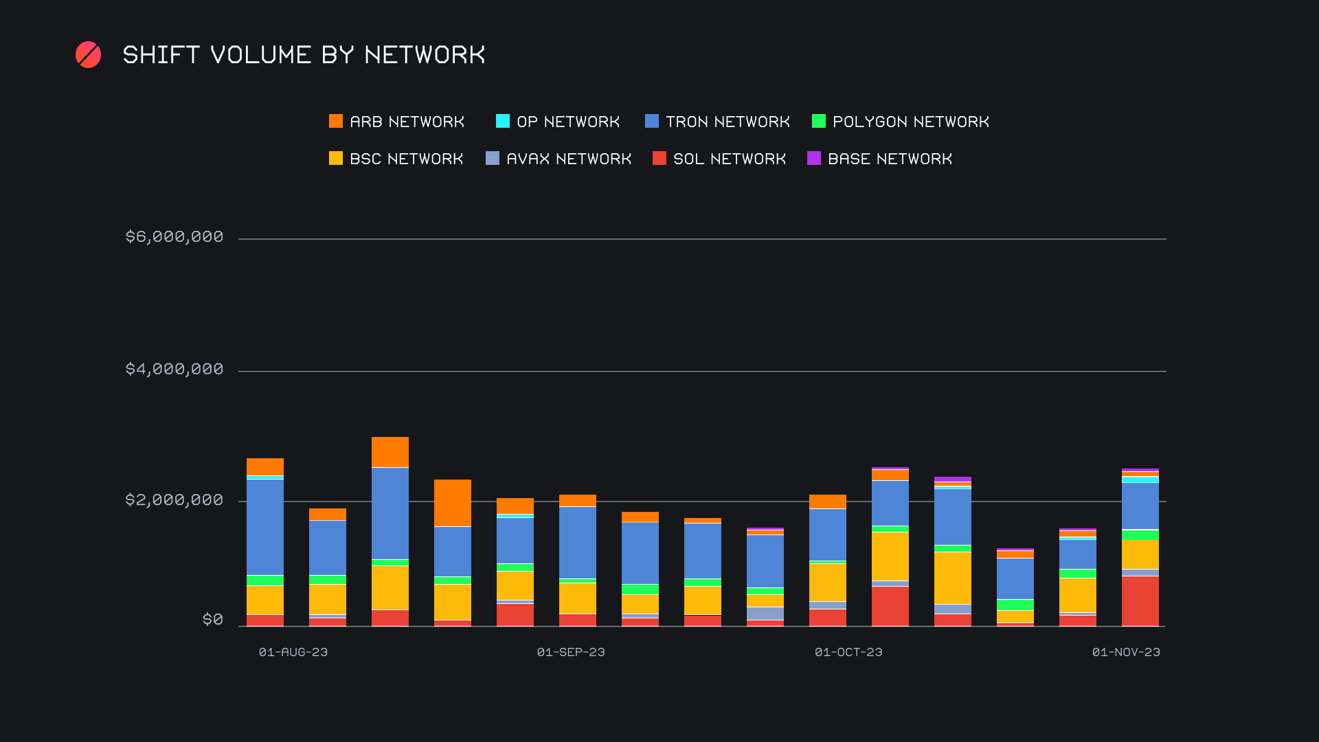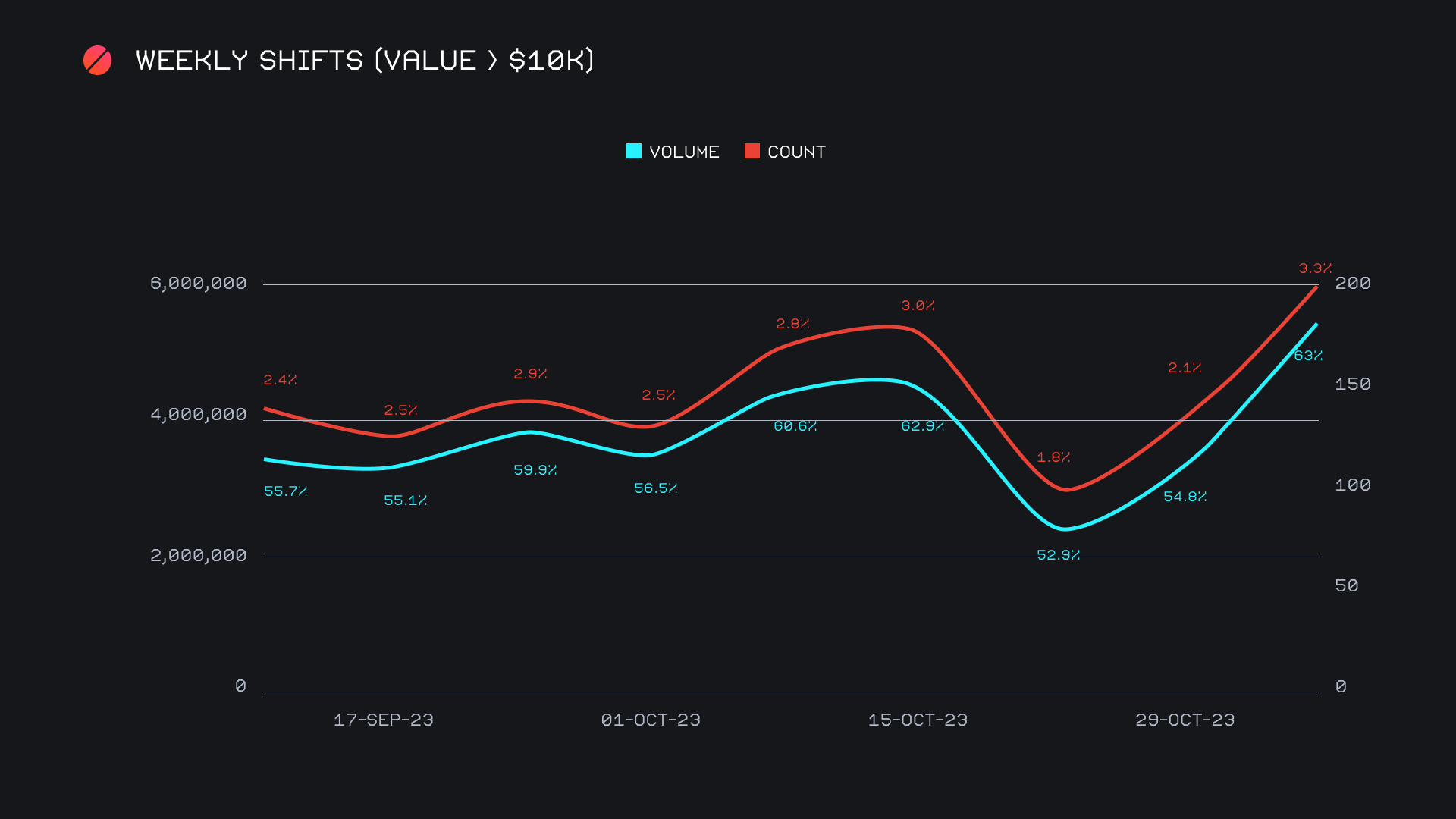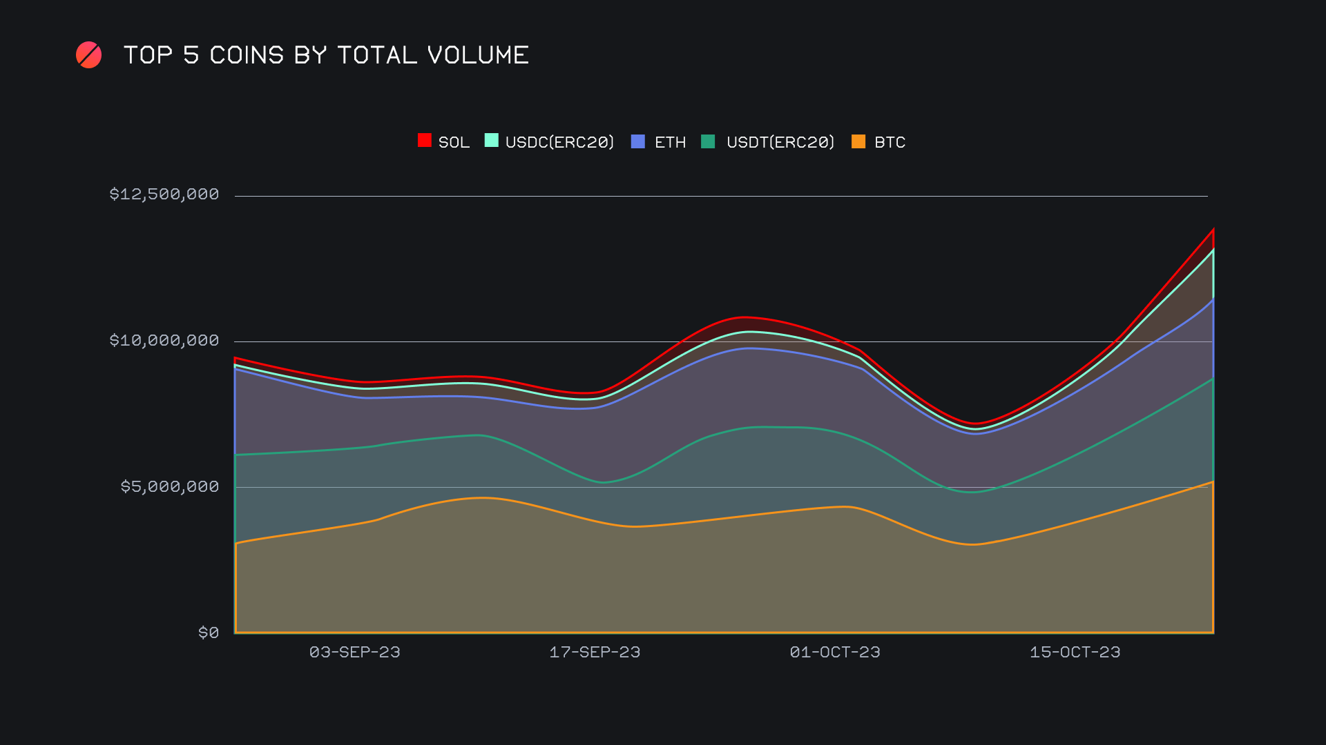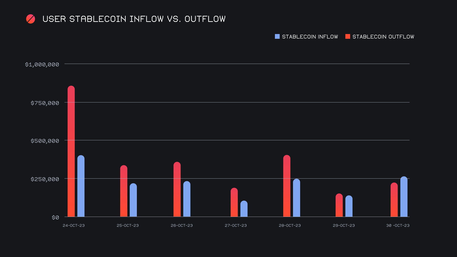A final interesting observation is that the surge in stablecoin volume mainly occurred on October 24th, 2023, coinciding with the hefty market pump. Along with being our highest volume day of the week, it was also a dominant day for stablecoin shifting, as seen in the chart below. October 24th alone saw ~$860k in stablecoin settlements, with USDT (ERC-20) and USDC (ERC-20) accounting for respective settlement totals of $467k and $306k. This gives the impression that users are still keen to capture some gains, moving into stablecoins during periods of upwards volatility.