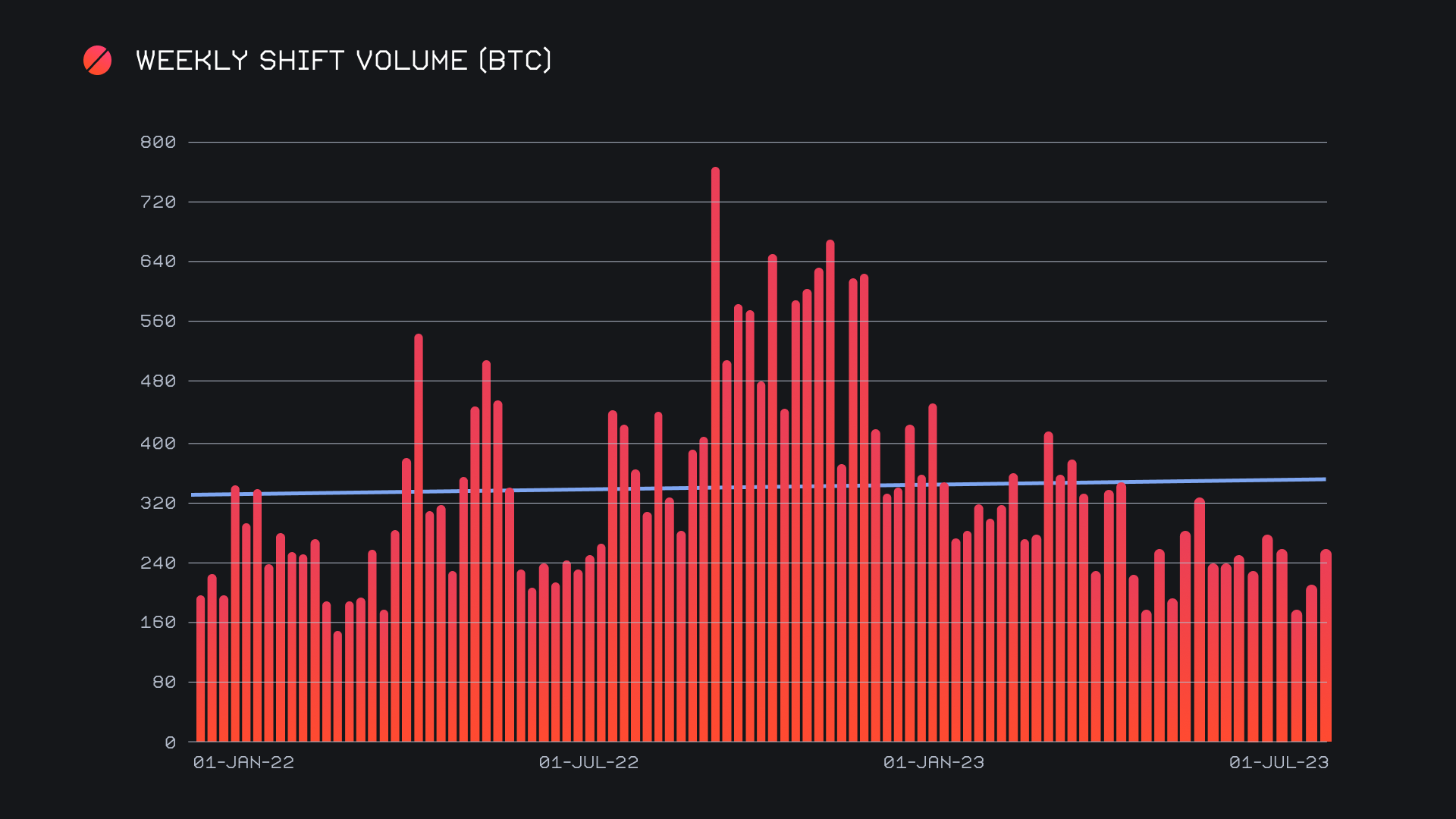 For the second consecutive week, SideShift has experienced a weekly volume growth exceeding 35%. This week saw gross volume jump an impressive 40.6% to end the period with $8.7m. Meanwhile, gross shift count actually experienced a slight dip of -4.5% for a total of 6,146 shifts, indicating that we saw a substantial increase in large scale shifts this week. Our top integrations enjoyed a boost in shifting, but the majority of the increase in gross volume can be attributed to shifts occurring directly on the site. Together, these figures combined to produce daily averages of $1.2m on 878 shifts. When denoted in BTC, our weekly volume amounted to 253.94 BTC (+23.2%), a nearly identical weekly change to that noted in the previous report.