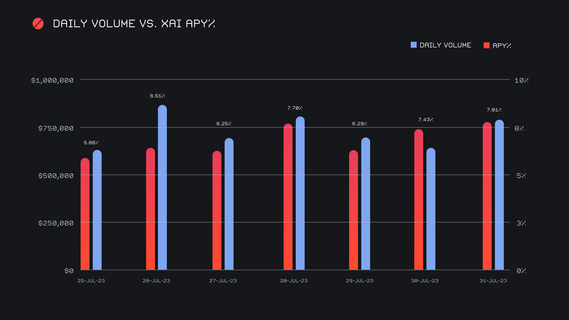 XAI stakers were rewarded with an average APY of 7.0% this week, with a daily rewards high of 22,712.78 XAI (an APY of 7.81%) being distributed to our staking vault on July 31st, 2023. This was following a daily volume of $787k. This week XAI stakers received a total of 139,864 XAI or $14,842.10 USD in staking rewards.