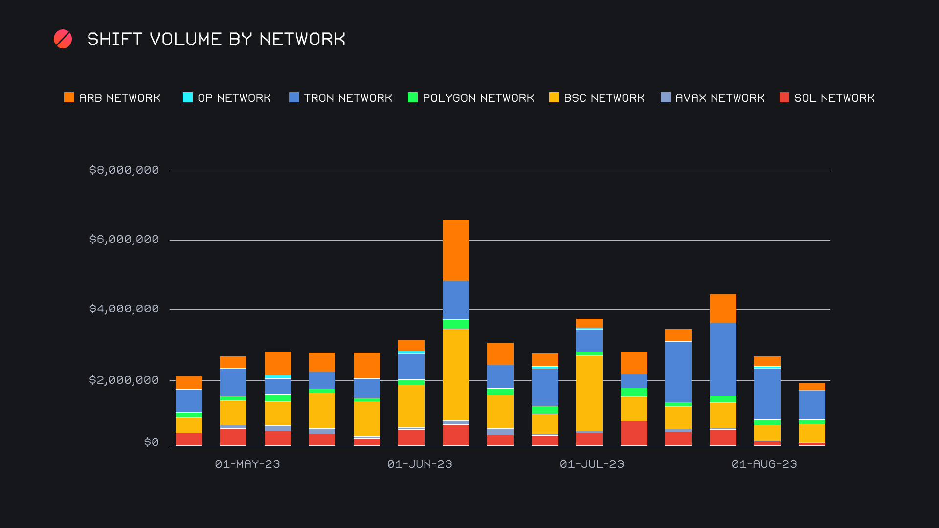 SideShift had another slow week, ending the period with a gross volume of $5.1m (-22.9%) alongside a shift count of 4,486 (-6.5%). It is quite possible that this summer lull is the result of users taking the lack of volatility as an excuse to step away from their computers - the ebb and flow is constant throughout the year. This week’s totals combined to produce daily averages of $733k on 784 shifts. When denoted in BTC, our weekly volume amounted to 175.31 BTC (-22.6%).