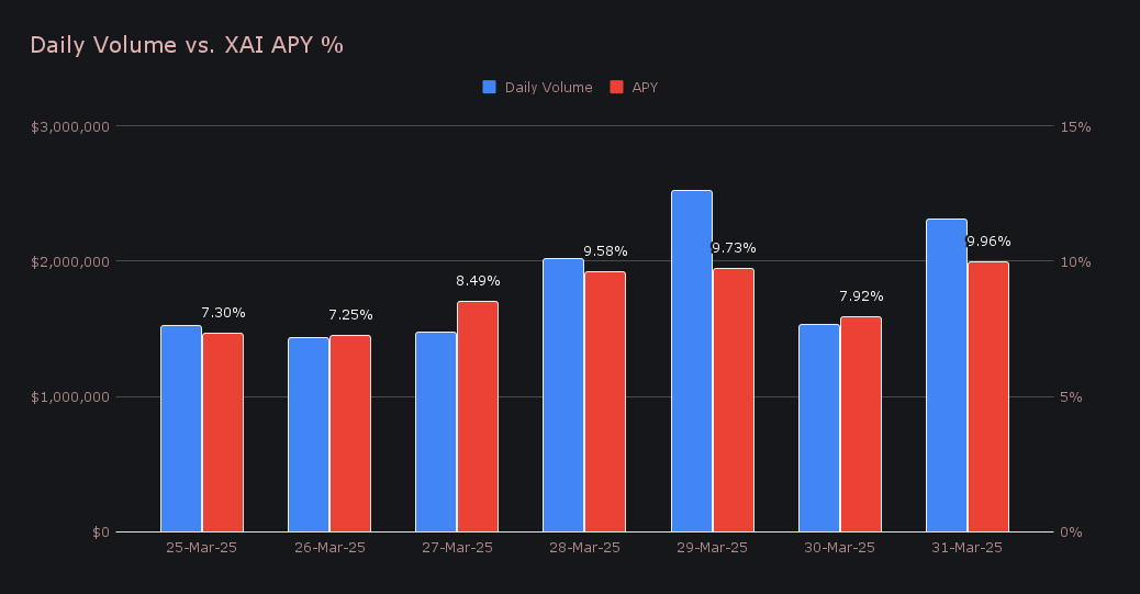 Staking activity remained solid, with our weekly average APY holding at 8.60%. April 1st marked the highest daily rewards output deposited directly to our staking vault, with a total of 34,254.05 XAI. This came as the result of a daily APY peak of 9.96%, alongside a daily volume of $2.3m. All together, XAI stakers received a total of 208,211.78 XAI, or $29,236.48 USD in staking rewards this week.