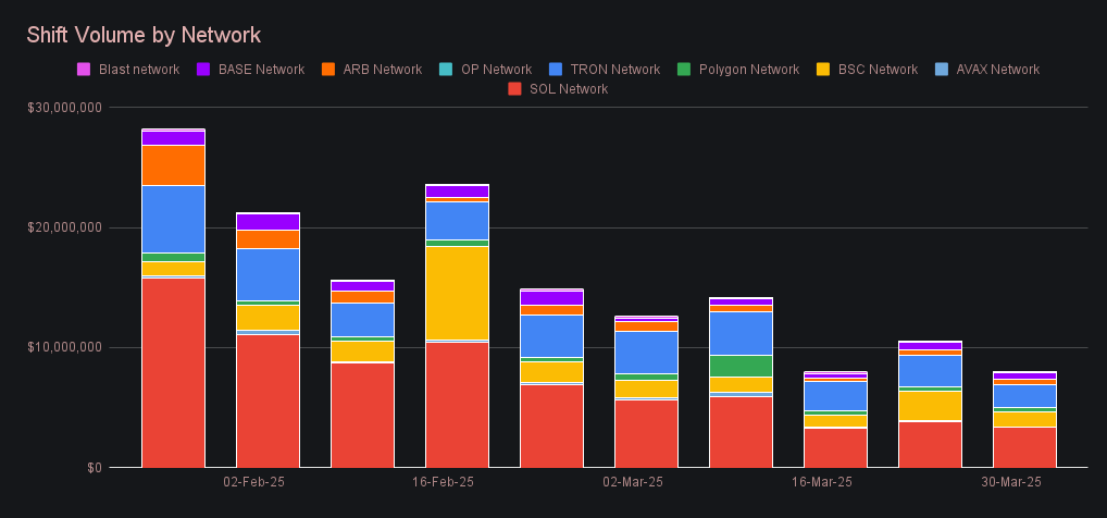 ETH network shifts totaled $7.0m this week, adding another ~$1m (+15.6%) and drawing clear momentum away from alternate networks, which combined for just $7.9m - a cumulative drop of -24.3% and sliding to their lowest total in several months. The Solana network still led the group but declined -12.3% to $3.4m, while the TRON network followed with $1.9m (-26.6%). Binance Smart Chain was hit the hardest, falling -51.5% to $1.2m, whereas the Polygon network stood out as the only alternative to post a meaningful gain, increasing +22.6% to $404k. Other networks including Base, Arbitrum, and AVAX also recorded steep declines, while OP and Blast remained insignificant despite small upticks.