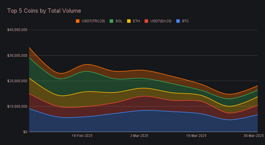 USDT (ERC20) followed in second place with a total volume of $3.7m. Similar to BTC, it saw highly symmetrical user activity, with deposit volume totaling $1.7m (+38.3%) and settlements slightly ahead at $1.9m (+38.2%). As compared to other stablecoins, this week’s volume was notably concentrated in USDT (ERC-20), as its total volume surpassed that of all other top stablecoins combined. Behind BTC, it recorded the highest weekly gain among our top coins.