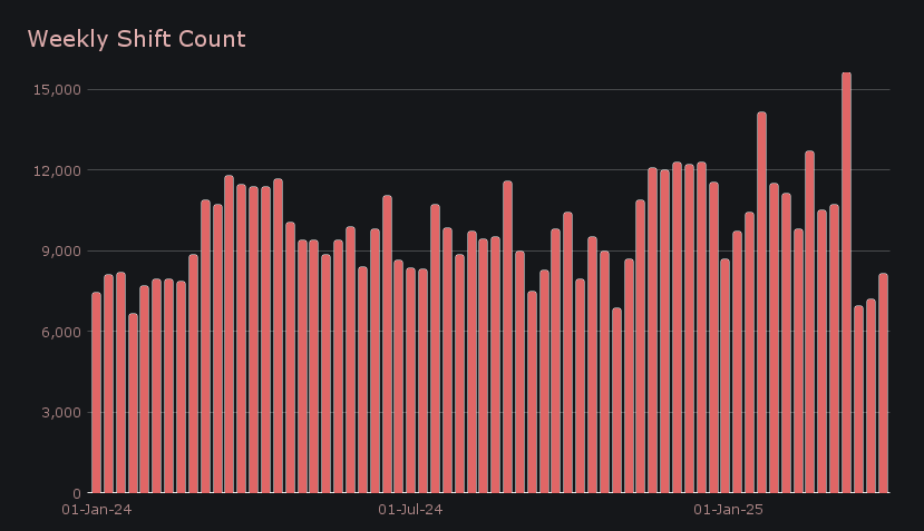 This week marked a strong rebound for our top affiliates, with combined volume climbing +68.5% to $5.49m - a return to the more typical range seen throughout the year. All three of our leading affiliates saw meaningful increases, with our first place affiliate holding onto the top spot and boosting volume +75.4% to $2.43m. Their shift count rose a near identical +77% to 649 shifts. Our second place affiliate surged +270.8% to $1.49m, regaining momentum after a quiet showing last week. Meanwhile, third place remained steady as ever, recording a respectable 1,095 shifts (+5.7%) alongside $810k in volume.
