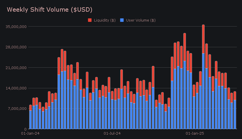 SideShift recorded a gross weekly volume of $12.8m (+3.5%), landing just slightly above last week’s total. Volume attributed to liquidity shifting dropped -14.4% to $2.8m, meaning that user volume was the clear driver behind the increase, rising +10.1% to finish just shy of $10m. An interesting observation this week is how closely aligned deposit and settlement volumes were for top coins, which contributed to the reduced need for inventory rebalancing. This tighter balance between deposits and settlements helped lower our reliance on liquidity shifts - and as a result, kept overall volume growth more modest despite increased user activity.
