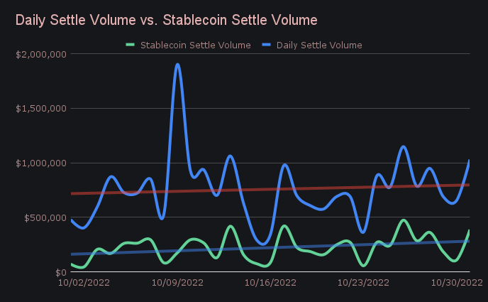 Settlement volume on SideShift for coins outside of the top 10 continues to hover around 10%, a level that it has stayed at for most of the year. Despite little movement, it is still good to see the occasional boom in “less popular” coins. To list a couple, the total volume of ADA increased by 717% to net $108k. Next, following Elon’s acquisition of Twitter and the massive DOGE rally, DOGE volume on SideShift grew by 716% and summed to $151k.