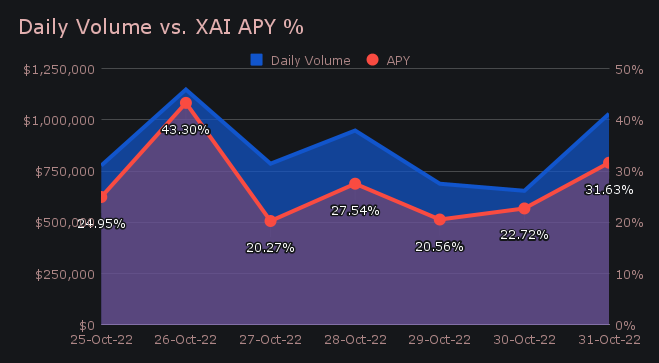 SideShift had a steady week with solid volume carrying on through the weekend. This produced an average APY of 27.28%, which is almost exactly on par with our all time average (currently 27.1%). A weekly rewards high of 37,902.46 XAI was deposited to our staking vault on October 27th, 2022, following a daily volume of $1.15m.