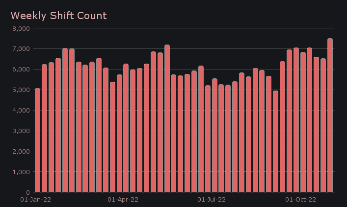 Alongside this volume spike was a total shift count of 7,448 (+14.8%). This was the highest recorded weekly shift count to date, and integrations played a big role in this achievement. Volume and shift count combined to result in daily averages of $862k on 1,064 shifts for the period.