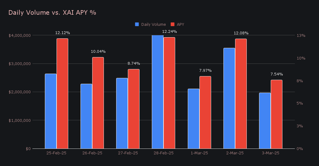XAI stakers saw steady returns, earning an average APY of 10.10%. The largest payout occurred on March 1st, when 41,452.81 XAI was distributed directly to the staking vault at an APY of 12.24%, coinciding with a peak daily volume of $4.07m, By week’s end, stakers had accumulated a total of 241,723.93 XAI, valued at $42,883 USD.