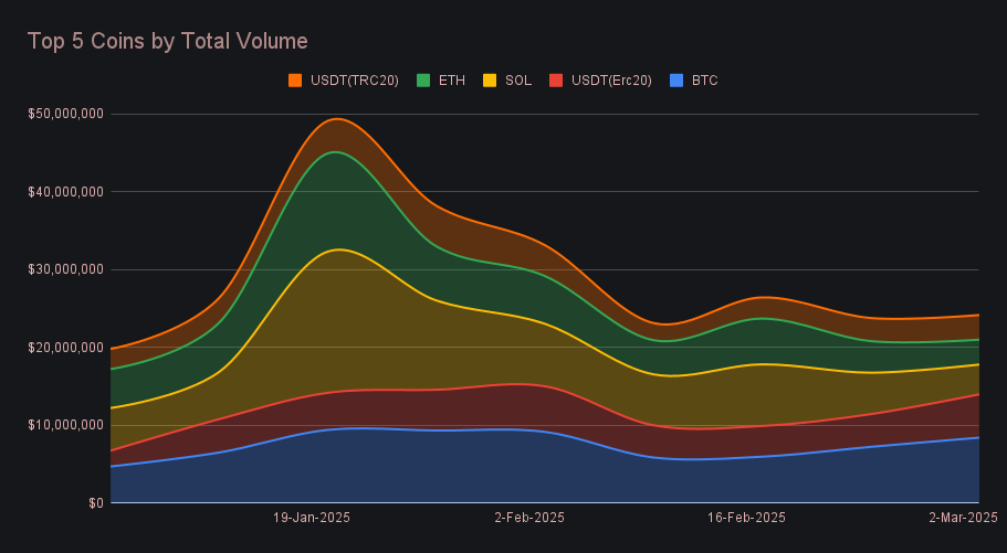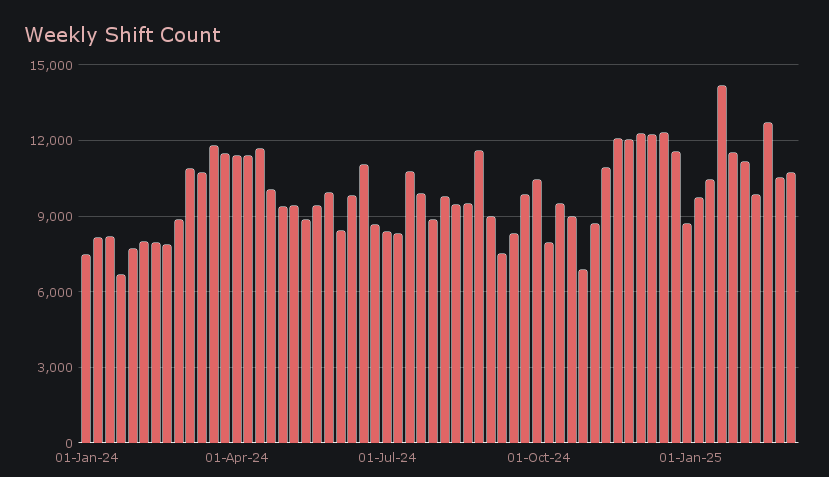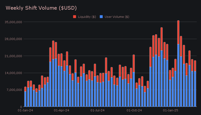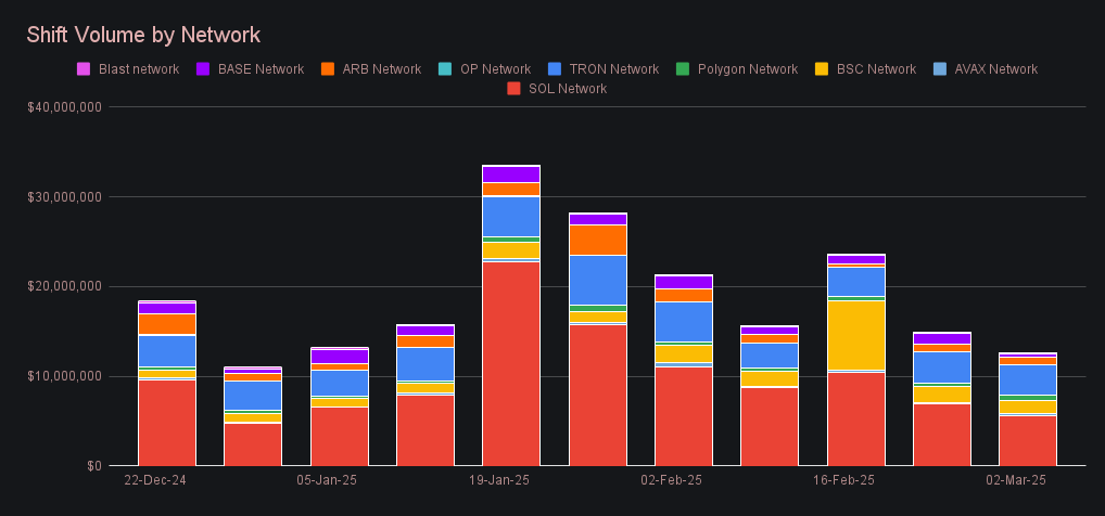 Meanwhile, our gross shift count climbed +2% to 10,712 shifts, finishing just -4.2% behind its running YTD average. A notable spike in activity occurred on March 3rd, which alone netted 2,337 shifts, a daily figure that has only been achieved a few times in SideShift’s history. This strong engagement carried through the end of the period, resulting in daily averages of $2.72m in volume across 1,530 shifts, with momentum continuing into the current week.