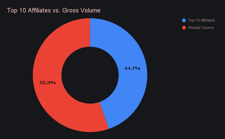 Altogether, top affiliates accounted for 44.7% of total volume, climbing +9.5% from last week’s share.