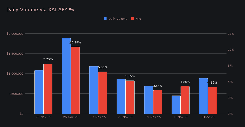 XAI stakers earned 155,011.20 XAI ($19,009.74) at an average APY of 5.98% as rewards followed the quieter tempo of the week. The standout came on November 26th, when 37,820.27 XAI was distributed to the staking vault at 10.39% APY backed by $1.88m in daily volume. Beyond that peak, the rhythm held steady and matched the overall flow of activity on the platform.