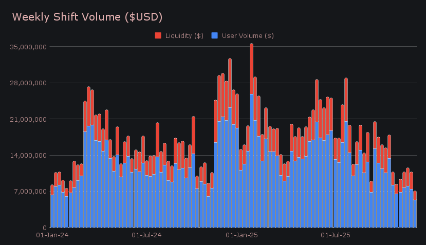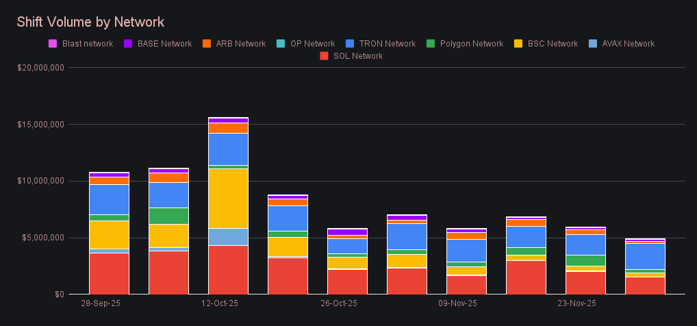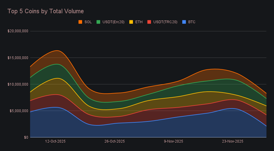 SideShift rounded out the period with $7.01m in total volume (−34.7%), the quietest stretch of 2025 and a stark contrast to last week’s steady $10m+ rhythm. User volume contributed $5.40m (−27.7%), while liquidity shifting halved to $1.61m (−50.7%), a sum that reflected a far more balanced two way flow, and therefore a reduced reliance on internal rebalancing. This week’s top user pairs were USDT(TRC-20)/ETH at $492k, BTC/USDT(ERC-20) at $260k, and L-USDT/USDT(ERC-20) at $194k. The large BTC-settling routes that led last week did not return at the same scale or ranking, and were replaced by smaller ETH and USDT paths, with last week’s $624k second-place pair nearly triple the size of this week’s $260k BTC/USDT(ERC-20) result.