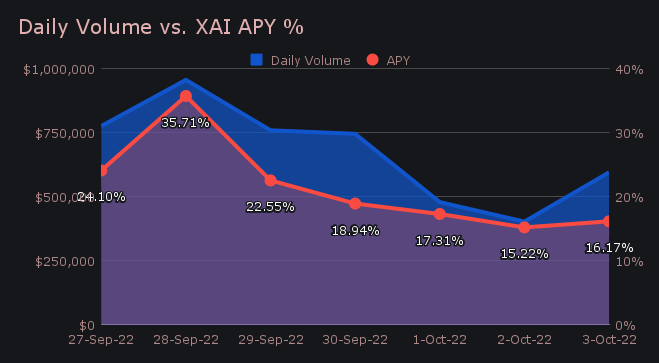 Following a strong performance last week, XAI staking began to cool off. Still, we saw a handful of shifts to svXAI as the week carried on. Nevertheless, XAI stakers were rewarded with a respectable average APY of 20.74%. A weekly rewards high of 31,533.86 XAI was deposited to our staking vault on September 29th, 2022, which generated 35.71% APY. This was following a daily volume of $956k.