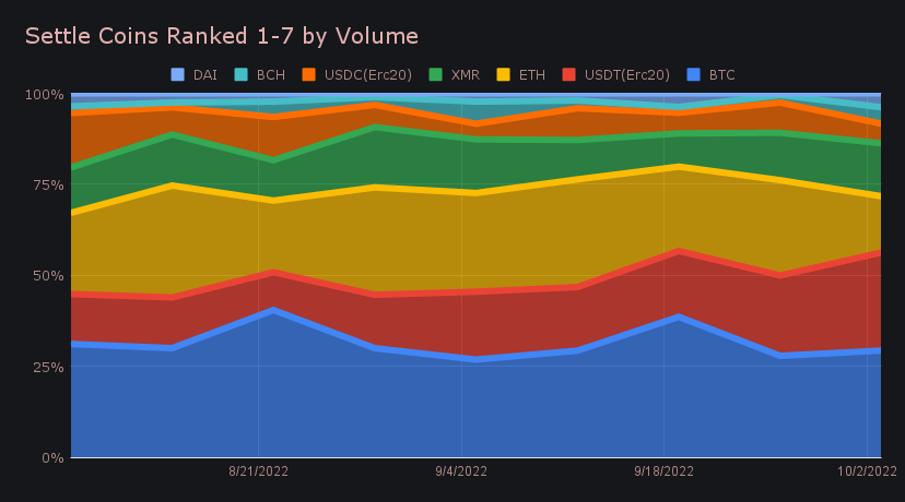 Just as was the case last week, we saw BTC triumph as the most shifted coin overall. Total BTC volume (deposits + settlements) was $2.69m. While a 6.6% reduction from last week, it remained ~70% higher than second placed XMR, which had a total volume of $1.58m.