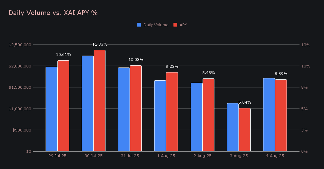 On the staking side, things stayed active. XAI stakers earned a total of 228,313.07 XAI, equating to $34,583.26 in weekly rewards. The average APY came in at 9.09%, with July 31st marking the high point - a daily reward of 41,995.27 XAI was distributed directly to our staking vault at an APY of 11.83%, following $1.95m in daily volume. The overall total marked a slight decline from the previous week, in line with a general slowdown in site activity.