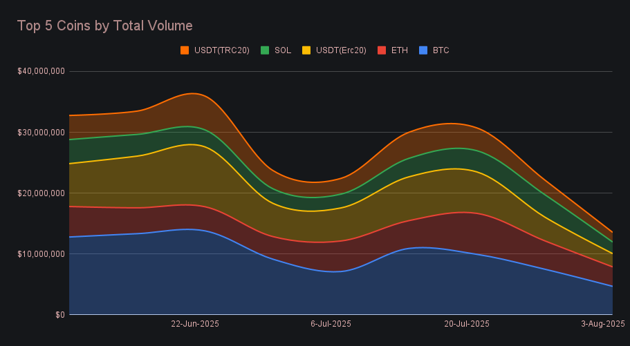 Stablecoins completed our top 5 by total volume, though it was a sharp step down for the usual leaders. USDT (ERC-20) amassed $2.19m, marking a −44.0% decrease and a clear deviation from the $8m+ weeks it routinely recorded just last month. Tron’s USDT (TRC-20) followed with a −34.2% drop to $1.59m, driven by a steep −30.9% fall in settlement volume to $790k. Meanwhile, a trio of less common stablecoins, USDT (BSC), USDC (SOL), and L-USDT, quietly trended upward, ranking 6th, 8th, and 10th respectively. USDT (BSC) led the group with $1.44m in weekly volume, and together they posted an average gain of +34.3%, a rare pocket of growth amidst an otherwise red week.