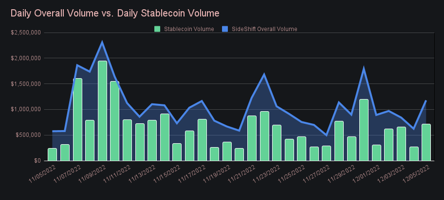 Stablecoin settlements combined to represent 37.1% of the weekly total, noting a rise of 2.1% from last week. This is the pushing against the upper boundary for stablecoin settlement proportion, and ties the record for the highest percentage recorded. The demand for USDT (ERC-20) is mainly responsible for this rise, but it should be noted that USDT and USDC on other chains such as BSC and Polygon recorded settlement sums far above their all time averages. The below chart compares total stablecoin volume (deposits + settlements) to daily volume on SideShift for the past 30 days - you can observe that volume spikes usually coincide with more stablecoin shifting. Recently, the majority of this has been driven from stablecoin settlements.