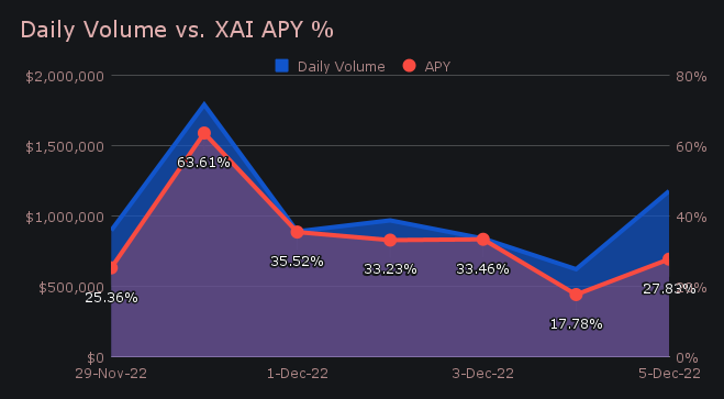 XAI stakers were rewarded with a very steady APY throughout the week, which averaged to 33.83% for the period. A daily rewards high of of 64,761.9 XAI (63.61%) was deposited to our staking vault on November 30th, 2022. This followed a respectable net daily volume of $1.79m.