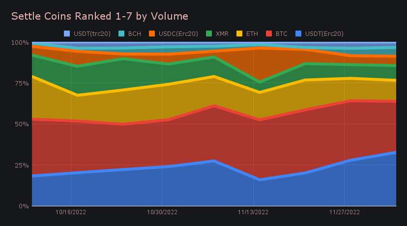 On the settlements side, USDT (ERC-20) seized first place with a settle volume of $2.04m (+24.0%). This move dethroned BTC, which had held the title for the previous 11 weeks. It is also among the highest weekly settle volume for a single stablecoin this year. The rise in popularity of USDT (ERC-20) is notable in the chart below. BTC was however very close behind, with $1.95m (-9.2%). The same can not be said for third placed ETH, which was less than half that of BTC. It finished with $801k, marking a slight decrease of 0.8%. One out of the norm boom was Zcash (transparent), which saw its settlements more than 30x from last week, to net $203k. These sporadic settlement bursts appear to happen from time to time with Zcash, as mentioned in previous reports.