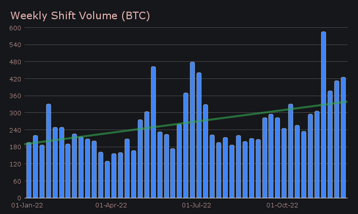 SideShift had a strong week with momentum carrying on throughout the weekend. We concluded the period with a net volume of $7.20m (+6.7% from last week) alongside a shift count of 6,368 (-0.8%). These sums resulted in daily averages of $1.03m on 910 shifts. In BTC terms, this amounted to 424.23 BTC, marking an increase of 3.0% from last week.